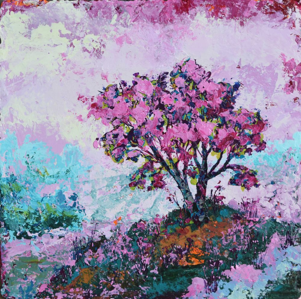 Experience the enchanting allure of "Adorning the Wind," where a vivid tree bursts forth with life against a backdrop painted in soft pastels. This piece reveals the interplay of color, inviting you to explore its vibrant essence. The lush blooms resonate with a joyful spirit, while hints of green echo the tranquility of nature.